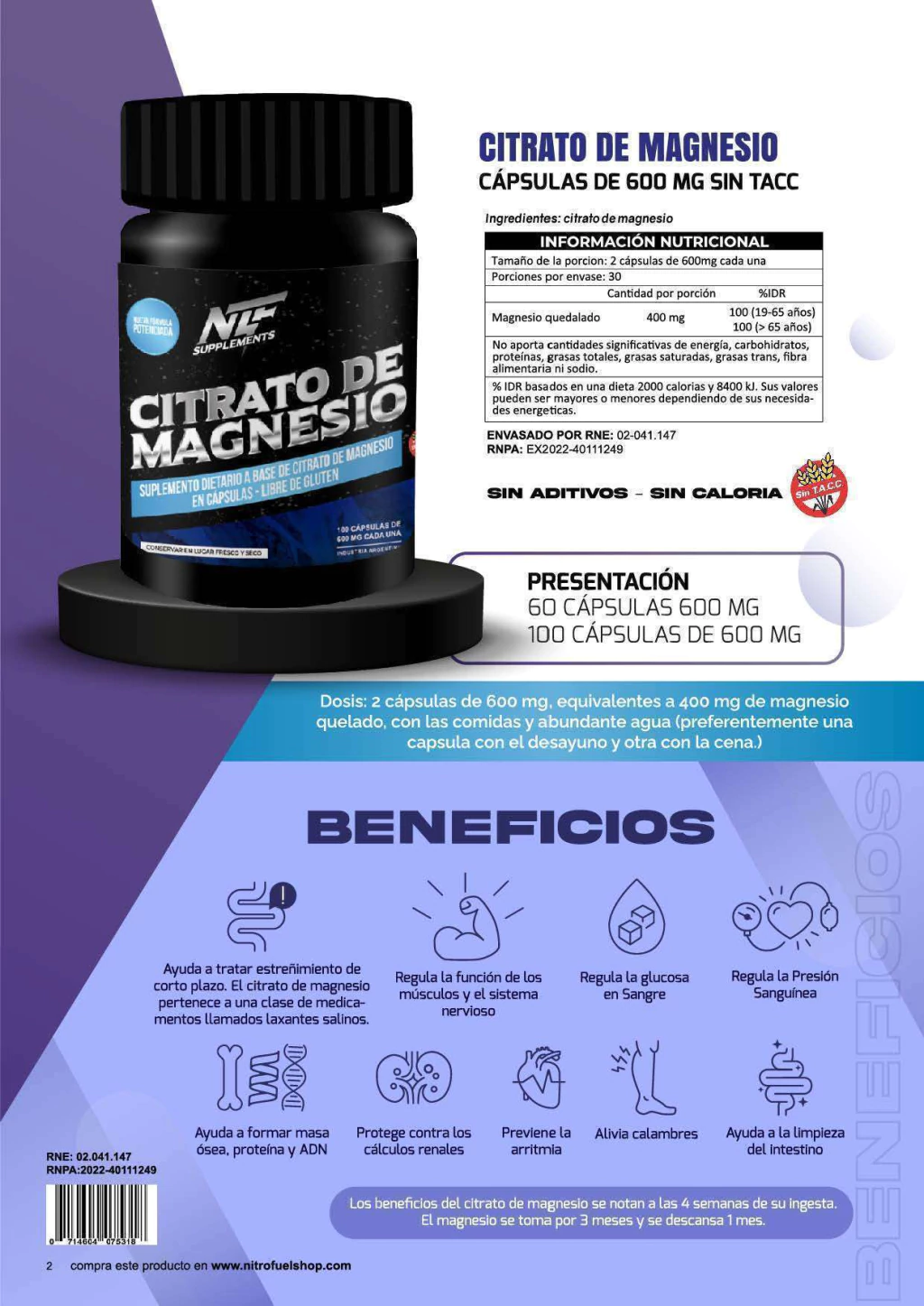 Cada cápsula contiene 600 mg de citrato de magnesio.